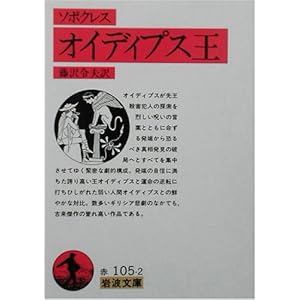 ソポクレス『オイディプス王』(岩波文庫、藤沢令夫訳 ~ ソポクレス『オイディプス王』(岩波文庫、藤沢令夫訳)オイディプスが先王殺害犯人の探索を烈しい呪いの言葉とともに命ずる発端から恐るべき真相発見の破局へとすべてを集中させてゆく緊密な劇的構成。発端の自信に満ちた誇り